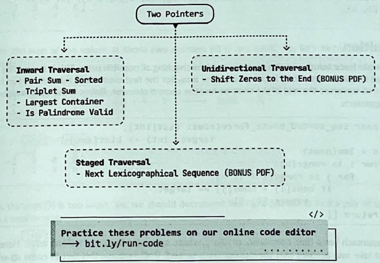The two-pointer pattern is very versatile and, consequently, quite broad. As such, we want to cover more specialized variants of this algorithm in separate chapters, such as Fast and Slow Pointers and SlidingWindows.