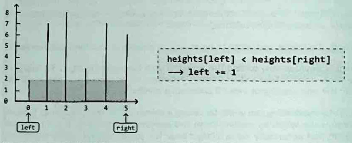 This leaves height as the determining factor. In this case, the left line is shorter than the right line, which means that the left line limits the water's height.Therefore, to find a larger container, let's move the left pointer inward: