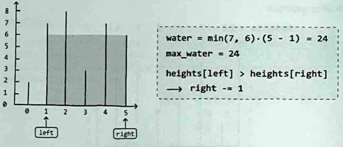 The current container can hold 24 units of water,the largest amount sofar.So,et's update max_water to 24. Here, the right line is shorter,limiting the water's height. To fnd a larger container,move the right pointer inward: