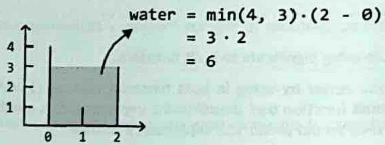 If we have two vertical lines, heights[i] and heights[j],the amount of water that can be contained between these two lines is min(heights[i], heights[j]) * (j - i), where j - i represents the width of the container. We take the minimum height because filling water above this height would result in overflow.