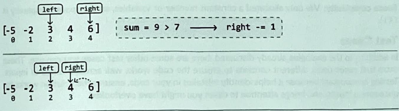 - If their sum is greater than the target, decrement right, aiming to decrease the sum toward the target value.