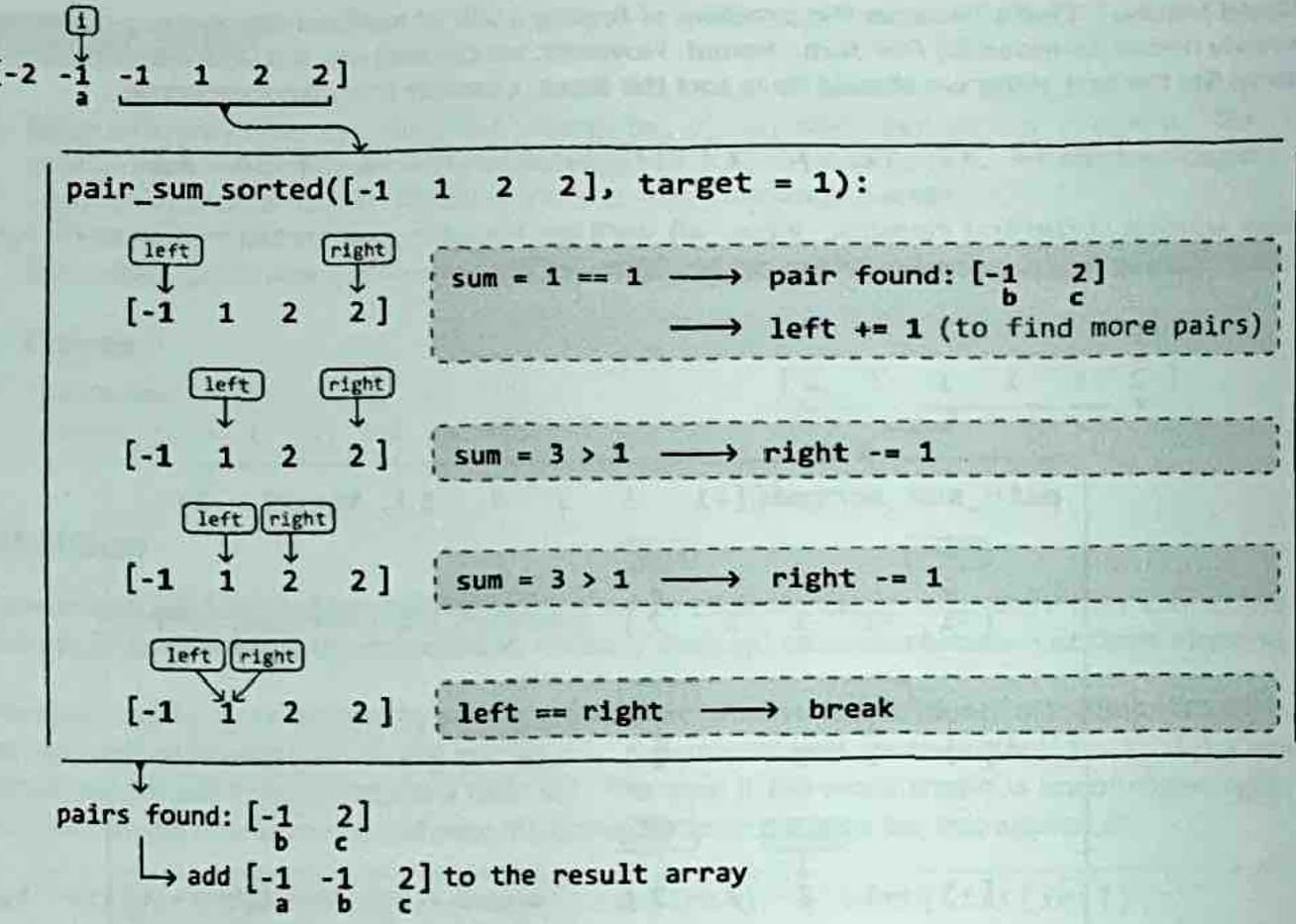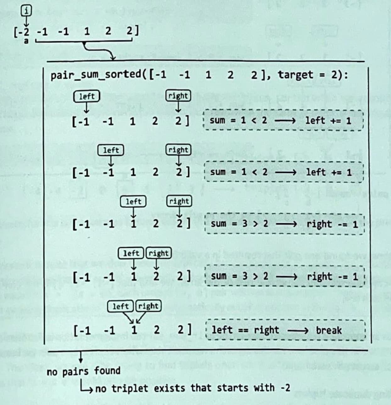 As you can see, when we called pair_sum_sorted, we did not find a pair with a sum of 2. This indicates there are no triplets starting with -2 that add up to 0.